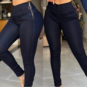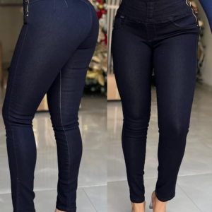 El acabado brilloso que estiliza, el efecto moldeador de abdomen y glúteos, y la tela más flexible que un denim común.